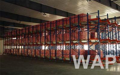 • 存貨:由叉車將貨物放在貨架巷道導軌的前端,通過無線電遙控操作的WAP-1穿梭車,可以承載托盤貨物在導軌上運行;