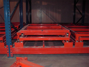 后推式貨架系統(tǒng)(也稱為壓入式貨架),此貨架系統(tǒng)高效地利用了存儲空間,經(jīng)常用為物流中心貨架。依據(jù)“先進后出”的原則把貨物放置在傾斜的滾道上,運載臺車沿軌道運行,托盤放置在運載臺車上依次被后推至貨架內(nèi)部,有效深度在5個托盤位,取貨時第一個拉盤提取后,下一個托盤自行滑至取貨點,有效地利用單一通道進行存取,尤其適用于貨物中轉(zhuǎn)區(qū)的存儲管理。
