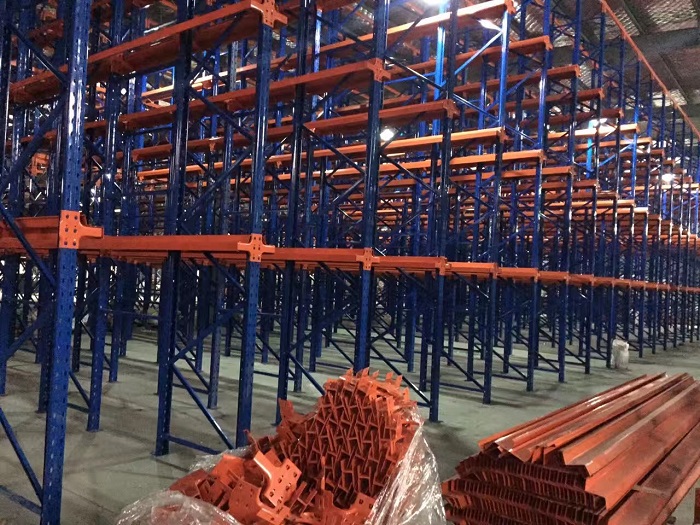 貫通貨架在同樣的空間內(nèi)比通常的托盤貨架多很多儲(chǔ)存能力,因?yàn)槿∠挥诟髋咆浖苤g的通道,將貨架合并在一起,使同一層同一列的貨物互相貫通。